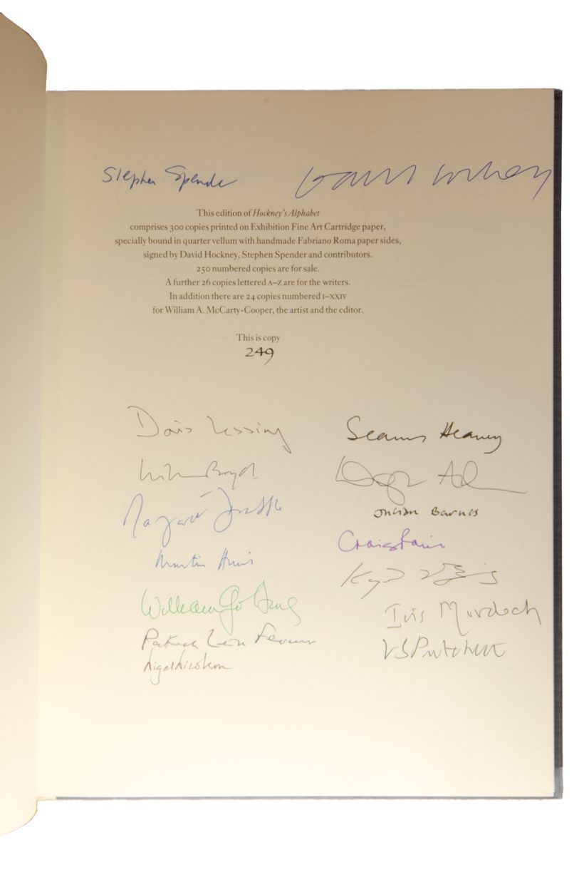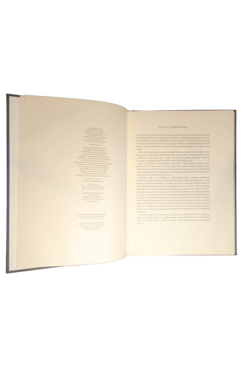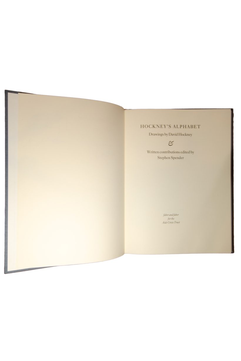 Drawings by David Hockney & Written Contributions edited by Stephen Spender. Published by Faber & Faber for the AIDS Crisis Trust. Signed by Hockney and Spender and twenty-two contributors. This edition comprises 300 copies printed on Exhibition Fine Art Cartridge paper, specially bound in quarter vellum with handmade Fabriano Roma paper sides. This copy is No 249 of 250.