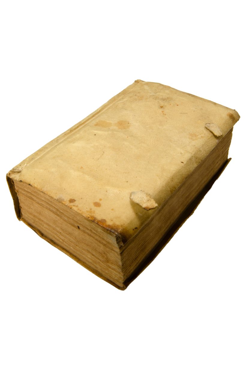 Condition: Fair. Vellum-covered. Some staining on the vellum. Some tearing on the cover. Previous owner's stamp on end-sheet. Small volume.